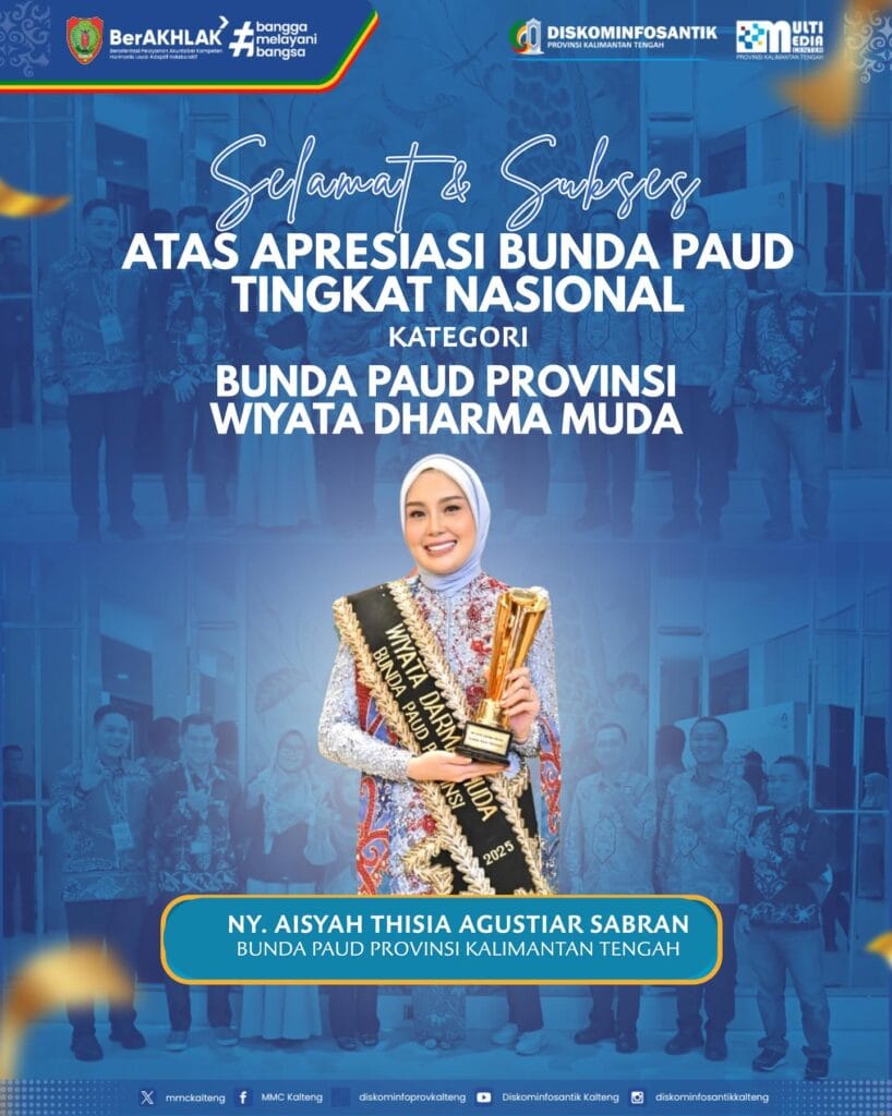 Penghargaan ini menjadi bentuk apresiasi atas komitmen dan peran aktif Bunda PAUD dalam memperkuat layanan PAUD yang bermutu, setara, dan berkelanjutan di seluruh wilayah Kalteng. Sebelum acara puncak, Aisyah Thisia Agustiar Sabran turut menjadi salah satu narasumber dalam Gelar Wicara atau Talkshow Apresiasi Bunda PAUD Tingkat Nasional 2025.